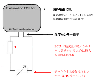 インジェクションECUは、排気ガス中の酸素濃度、スロットルの開度など様々なデータから燃料の噴射量を計算し決定しています。Booster Plugは、そのうちの吸気温度により燃料を調整している、つまり、吸気温度が低い場合は空気の密度が高くなり混合気が薄くなるので燃料噴射量を増やし、逆に吸気温度が高い場合は混合気が濃くなるので燃料噴射量を減らすように補正制御されている点に注目し、実際の吸気温データより周囲温度が低いとECUに偽の情報を流す(一定の抵抗値を加える)ことによって、ECUに純正マップと照らし合わせ、混合気を濃く(リッチ)補正させています。