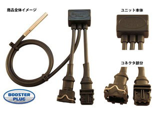 最近のバイクは、排ガス規制や燃費など問題からインジェクション方式をとっているマシンがほとんどですが、排ガス浄化と低燃費が両立するため、理論空燃比より薄い混合気を燃焼きせることで燃費を低減しNOxの発生を抑える希薄燃焼(リーンバーン)をさせています。しかし、希薄燃焼の欠点として、混合気を薄くすることによる、アイドリングが安定しない、低速走行時にギクシャクする、アフターファイヤーが生じる、などドライバリティの低下が挙げられます。 Booster Plug(ブースタープラグ)は吸気温度センサーとインジェクションECUの間にセットするだけでインジェクションの燃調を濃く(リッチ)して、これらの問題を解決し、ドライバリティを向上させようという製品です。