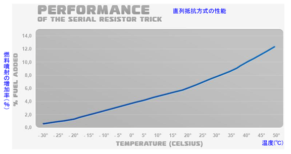 他のプラグアンドプレイ式デバイスで採用しているのがこの方式です。なぜうまく働かないのかがよく分ります。多くのデバイスが、周囲温度20℃での走行時によく働くようにできています。しかしこの方式では、10℃のとき混合気が薄くなり過ぎるし、30℃のときは濃くなり過ぎます。類似製品の製造メーカーは、このことをお客様に知らせるようなことはしません。
